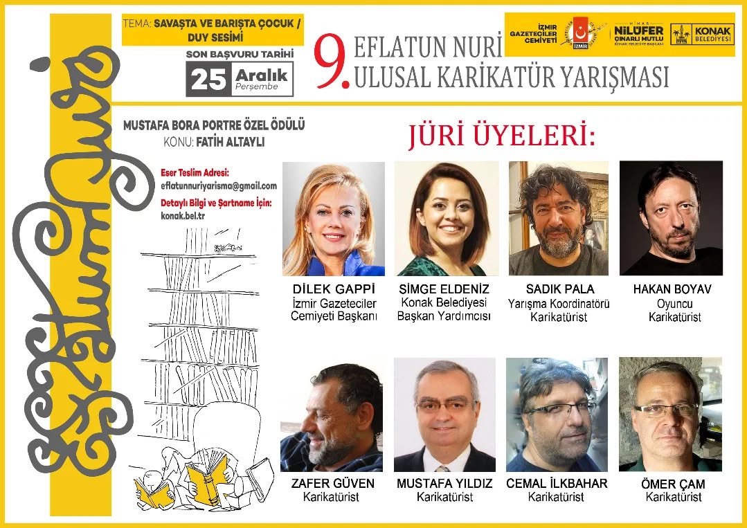 Konak Belediyesi ve İzmir Gazeteciler Cemiyeti (İGC) iş birliğinde düzenlenen ve her yıl heyecanla beklenen Eflatun Nuri Ulusal Karikatür Yarışması için başvurular başladı. Bu yıl “Savaşta ve Barışta Çocuk / Duy Sesimi” temasıyla, dokuzuncusu düzenlenen yarışmanın son başvuru tarihi 25 Aralık.
