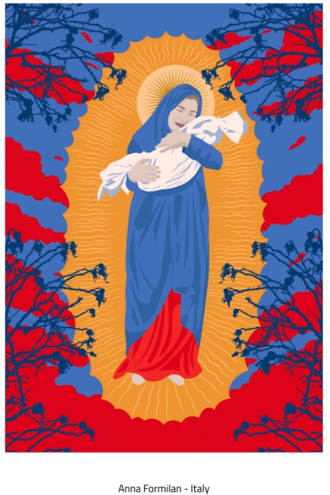 Her image reinterprets the classical canons of sacred representation, blending spirituality and modernity. We gaze thoughtfully at this Madonna who, amid brambles and reddish glows,silently cries out her pain for one of the countless victims of war she holds in her arms: a son wrapped in a shroud, like a sad “Pietà” of our times.
