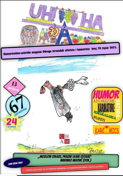| "Uh!Aha" sayı 70, Eylül 2025 Yeni bir kitap olan Hrvatskog E - Mizah, hiciv, karikatür ve karikatür dergisi, 13 kitapta 67 kitaptan oluşan bir