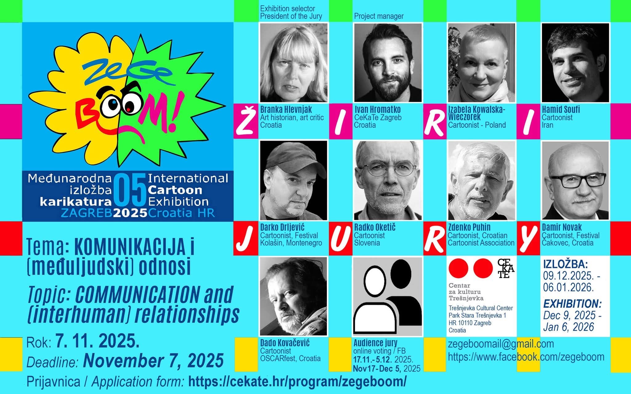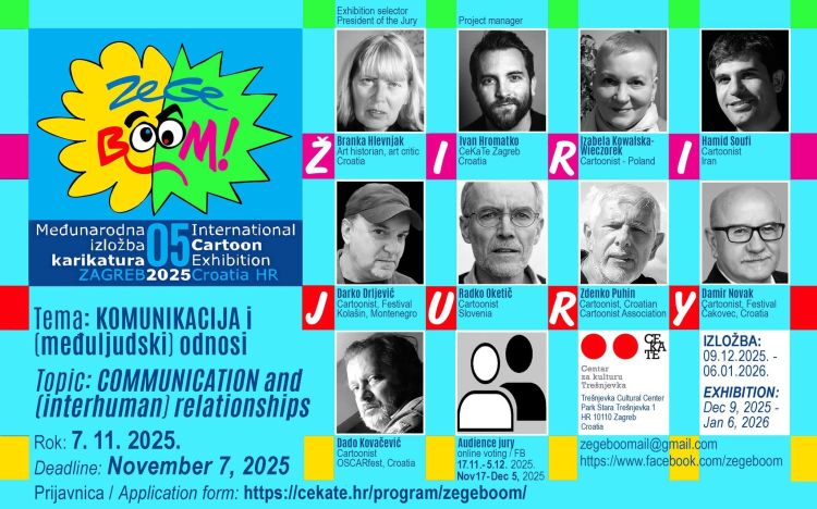 5th ZeGeBOOM! international Cartoon Exhibition: Open call for submissions (6th October listopada - 7th November 2025) Dear authors, colleagues and friends, We are pleased to inform you that we are opening a call for submissions of cartoons for the 5th ZeGeBOOM! International Cartoon Exhibition, which will be held in Zagreb in December 2025! After the themes EARTHQUAKE (2021), CROWD (2022), IDEAL CITY (2023) and GAMES in the CITY, this year's theme is COMMUNICATION AND (INTERHUMAN) RELATIONSHIPS Everyone is welcome to submit their views on this topic in the form described in the competition propositions! Read more information and the competition propositions on our website:https://cekate.hr/program/zegeboom/ Applications will be accepted only via the official application form (in Croatian or English), until midnight 7th November 2025. APPLICATION FORM...>> https://forms.gle/fpgzD7qodadpgGSq9 APPLICATION FORM (ENGLESKI jezik) 2025 PRIJAVNICA (HRVATSKI jezik) 2025...>> https://forms.gle/EUjpx3fRQxfstFCc8 As in previous years, ZeGeBOOM! is supported by the City Office for Culture and Civil Society of the City of Zagreb, to whom we would like to express our gratitude! Thank you in advance for your interest and cartoons! Feel free to forward this invitation to anyone you think might be interested in ZeGeBOOM! Best regards,ZeGeBOOM! team 6 Eki 2025 Pzt 14:29 --- After the themes of EARTHQUAKE (2021), CROWD (2022), IDEAL CITY (2023) and GAMES IN THE CITY, this year's theme is COMMUNICATION AND (INTERPERSONAL) RELATIONSHIPS Everyone is welcome to send their views on this topic in the form described in the propositions of the competition! The theme was described in more detail by art critic and exhibition selector Branka Hlevnjak: COMMUNICATION AND (INTERPERSONAL) RELATIONSHIPS Has communication become a one-way manipulation? Has reality been replaced by its technological surrogate? Are we sinking into the abyss of lethargy due to excess information? Are we letting our brains graze because we finally have our intellectual assistant Chat GPT? OR We sharpen critical thought. We strengthen empathy. We are becoming our own, international and planetary. Have we evolved into better people and smarter humanity through enhanced communication networks? OR We stand still without changing our nature since the beginning of civilization? Do we hear each other better or just faster and more superficial? Where has it disappeared and is inter-neighborly solidarity really forbidden? How does the media incite fear and spread hatred? The most severe form of destruction of humanity is forbidden communication, because people, despite their imperfection, are social beings. Mass media communication has been reduced to paid advertisements. Public speech was vulgalized. The world is screaming and cursing. Interpersonal intercourse is in diapers. The technology puts a pacifier in their mouth and a rattle under their hands. Have we taken a step forward or a step back? What can I say to that without saying a word? Applications for the competition are open from October 6 to November 7, 2025, and ANYONE interested can apply – regardless of experience, age, gender, religion, nationality or any other (more or less important) characteristic of the author. Authors can submit 1-3 "silent" caricatures (without text!), following the proposals of the competition and responding in their own unique and creative way to the given topic. Upon completion of the application, an expert jury will select the best among the submitted works, and then the public will be able to vote and choose the works that will be awarded. Regardless of the results of the voting, all participants will receive a certificate of participation, and their selected works will be published in the 3. ZeGeBOOM! A catalogue of caricatures. The winners of the competition will additionally earn valuable prizes! Online voting will be available worldwide and open from November 21 to December 3, 2024. The best works will be exhibited from December 10 to December 31, 2024 in the Small Gallery of the Trešnjevka Cultural Center, and all other submitted works will be available online – to allow everyone to enjoy the art of caricature! WORKFLOW: Competition/submission of works: 06/10 – 07/11/2025 Selection and voting of the expert jury, preparation of the catalogue of all authors: 08.11.-16.11.2025. Online public voting (e-catalogue with all authors): 17.11. – 5.12.2025. Publication of results (e-catalogue with selected and awarded authors): until 8.12.2025. OPENING OF THE EXHIBITION 09.12. (19h) 5. ZeGeBOOM! exhibitions, Modulor and Small Gallery EXHIBITION SETUP: 09.12. – 06.01.2026. Delivery of certificates (email): December 2025 – January 2026 Delivery of prizes (by mail): January 2026 Follow us on Facebook, where we will publish all the news! https://www.facebook.com/zegeboom PROPOSITIONS OF THE COMPETITION WHO CAN PARTICIPATE?The exhibition is open to all authors regardless of nationality, age, gender, religion, experience or profession. HOW TO PARTICIPATE?You can participate only by sending an official application form, which you need to submit within the given deadline – with the attachment of your work (or works). Papers received in any other way, as well as papers received without a completed application form, will not be accepted. APPLICATION:Application forms can be filled out in Croatian or English. Click to enter: APPLICATION FORM (ENGLISH) 2025...>> https://forms.gle/fpgzD7qodadpgGSq9 APPLICATION FORM (CROATIAN language) 2025...>> https://forms.gle/EUjpx3fRQxfstFCc8 WORK(S): 1 – 3 caricatures WITHOUT WORDS/TEXT:The work(s) may have been previously published, exhibited and awarded at other competitions. Format: A4 (210×297 mm), RGB, JPEG, 300 dpi, high resolution, maximum 10MB DEADLINE FOR SUBMISSION OF PAPERS: 07. November 2025 SELECTION The exhibition selector, art critic mr. sc. Branka Hlevnjak, selects 1 work from each author. EXPERT JURY AND PUB