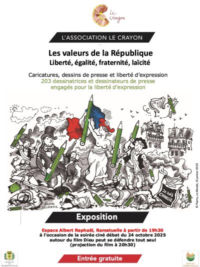 Après avoir rencontré un grand succès au Festival du livre de Mouans Sartoux et à l’occasion de cette soirée Le Crayon présentera également à l’Espace Albert Raphaël son exposition « Au bout du crayon : Les valeurs de la République : Liberté, Égalité, Fraternité, Laïcité : caricatures et dessins de presse » à partir de 19h30