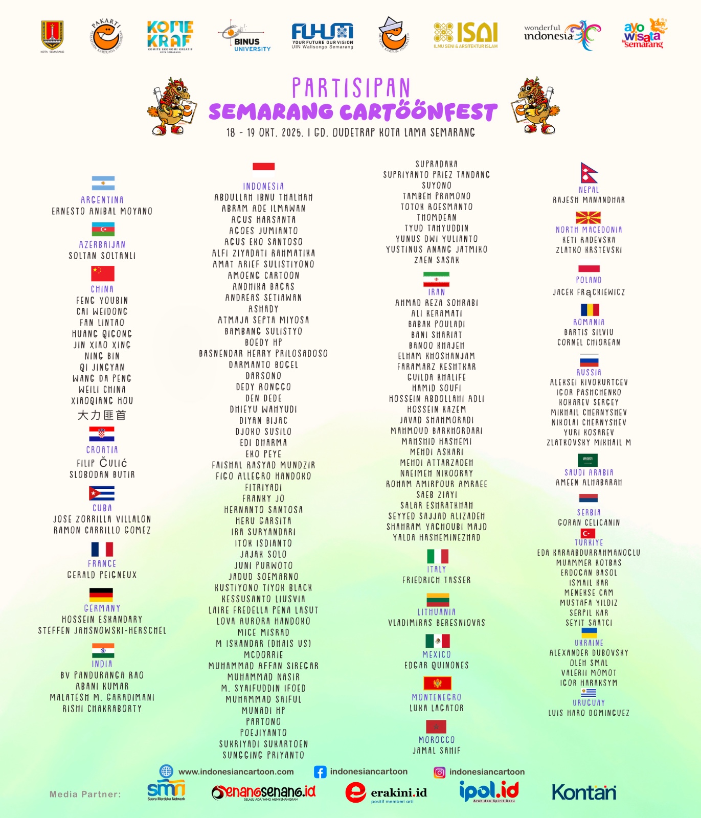 | 18-19 Ekim 2025 Oudetrap Binası, Eski Şehir, Semarang. Açılış: Cumartesi, 18 Ekim 2025, saat 09:00 WIB Gündem: - Odak Grup Tartışması 'Endonezya Karikatür Müzesi' (18 Ekim) - Genel Kurul (18 Ekim) - Uluslararası Sergi - Semarang Karikatür Festivali (18-19 Ekim) - Canlı Karikatür (18-19 Ekim) - Birlikte Karikatür Çiziyoruz 'Kresem Sanat Sokağı' (18 Ekim) |