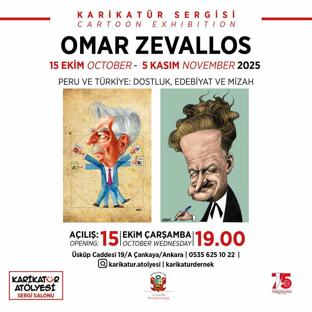 | La Embajada del Perú en Türkiye y Karikatür Atölyesi se complacen en presentar una muestra del reconocido caricaturista peruano Omar Zevallos, dedicada a la literatura peruana y turca. La exhibición se inaugurará con la presencia del artista el 15 de octubre a las 19.00 hrs. y permanecerá abierta al público hasta el 5 de noviembre. La actividad se enmarca en el 75 aniversario de las relaciones diplomáticas entre el Perú y Türkiye. |