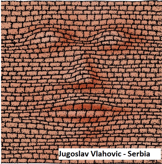 Jugoslav Vlahovic with the work that won the first prize used his highly personal and immediately recognizable graphic style to convey the essence of the meaning. The wall modeled on human features (or perhaps it is a face that has become a wall...) metaphorically symbolizes