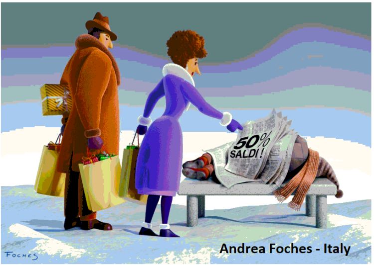Andrea Foches’ artwork immediately stands out for its pleasing composition and color scheme,which, aided by a highly effective three-dimensional effect, makes the satirical commentary immediately understandable. Here, wealth and poverty are cynically contrasted, with a couple only caring about buying gifts and not interested in the unsuspecting and cold homeless man on the bench, but only on the sales. Different lives and social conditions in a work that makes you smile, but also think.