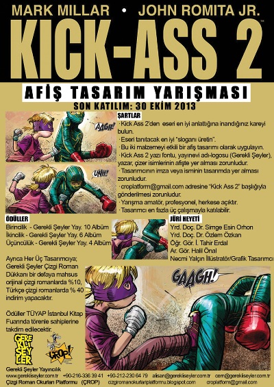 JR.'nin çizdiği "Kick Ass" Gerekli Şeyler Yayıncılığın dilimize kazandırdığı en önemli eserlerden biri. Bu sene sinemaya da uyarlanmış olan eser şu anda raflarda okurları bekliyor. Tabii bu yarışmayla da ödül kazanmak isteyen tasarımcıları.