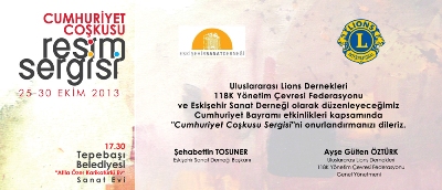 düzenlediği "Cumhuriyet Coşkusu" Karma resim sergimizin açılışını onurlandırmanızı dilerim... Şehabeddin Tosuner Es.Sanat Der.Başkanı |