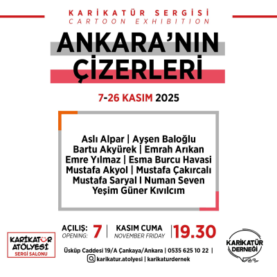 The group cartoon and illustration exhibition, titled "Illustrators of Ankara," opens at the Cartoon Workshop on Friday, November 7th. The exhibition features diverse perspectives by Aslı Alpar, Ayşen Baloğlu, Bartu Akyürek, Emrah Arıkan, Emre Yılmaz, Esma Burcu Havasi, Mustafa Akyol, Mustafa Çakırcalı, Mustafa Saryal, Numan Seven, and Yeşim Güner Kıvılcım. All art lovers are invited to the exhibition, which will open at 7:30 PM with the artists' participation.