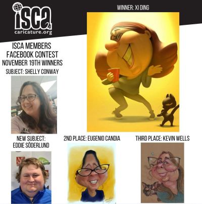 | "Congrats to the winners of our most recent ISCA Members FB Contest for their artwork of Shelly Conway (relative of cartoonafystudios)! 1st place - Xi Ding (xidingart), 2nd place - Eugenio Candia (@eugenio.candia67), 3rd Place - Kevin Wells (squiggleking) |