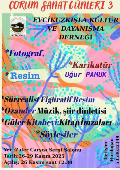 | 26 KASIM 2025 ÇARŞAMBA GÜNÜ SAAT 12 .30 DA ANKARA ZAFER ÇARŞISI ÇORUM SANAT GÜNLERİNDE BENİM DE SERGİM VAR..SANATSEVERLERİ BEKLERİM.. Uğur Pamuk |