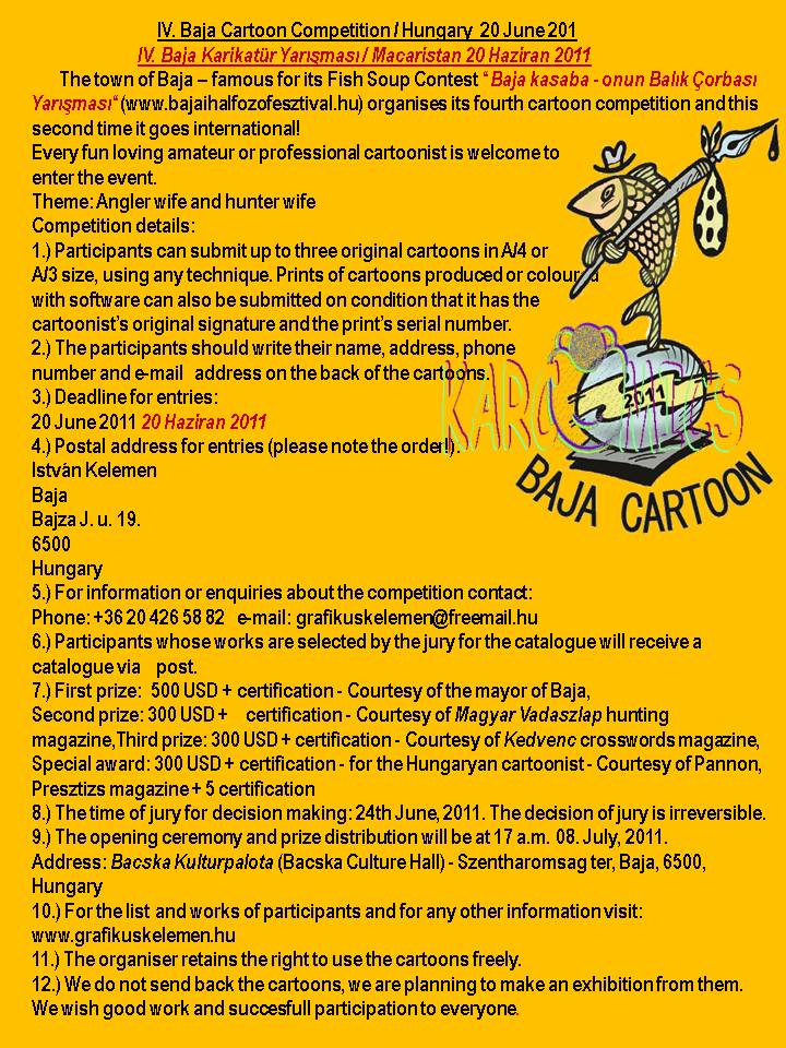 Dear Collegue, I am sending to you the announcement of the IVth. Baja Cartoon Competititon (2011). I hope I will meet your work. The theme: Angle wife and hunter wife. The correct deadline: 20. 06. 2011. (The time of jury for decision making: 24th June, 2011.) Friendly, Istvan Kelemen Cartoonist, organizer of contest /Sunday, April 03, 2011 3:42 PM |