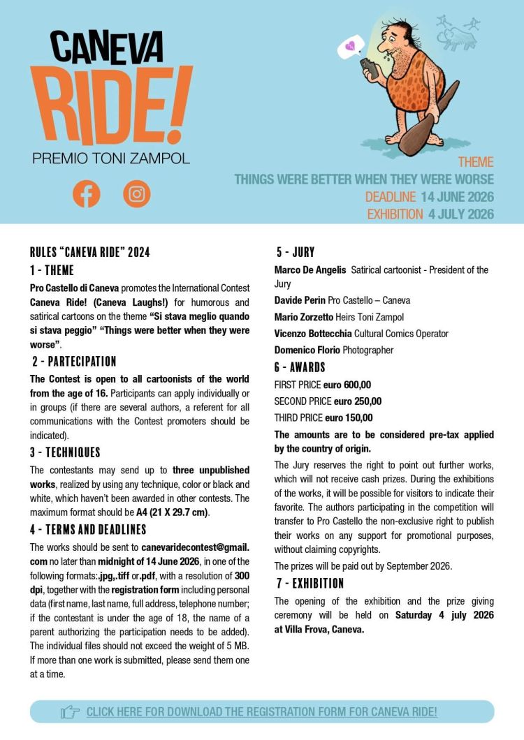 | CANEVA RIDE! PREMIO TONI ZAMPOL TEMA: KÖTÜ OLDUĞUNDA DAHA İYİYDİ SON BAŞVURU TARİHİ 14 HAZİRAN 2026 SERGİ 4 TEMMUZ 2026 KURALLAR “CANEVA RIDE” 2024 1-TEMA:Pro Castello di Caneva, “Si stava meglio quando si stava peggio” “Eskiden her şey daha kötüydü” temalı mizahi ve hicivli karikatürler için Uluslararası Caneva Ride! (Caneva Gülüyor!) Yarışmasını düzenlemektedir. 2 - KATILIM: Yarışma, 16 yaşından büyük tüm karikatüristlere açıktır. Katılımcılar bireysel olarak veya gruplar halinde başvurabilirler (birden fazla yazar varsa, yarışma organizatörleri ile tüm iletişim için bir referans kişi belirtilmelidir). 3 - TEKNİKLER: Yarışmacılar, başka yarışmalarda ödül almamış, herhangi bir teknikle, renkli veya siyah beyaz olarak gerçekleştirilmiş, en fazla üç adet yayınlanmamış eser gönderebilirler. Maksimum format A4 (21 X 29,7 cm) olmalıdır. 4- ŞARTLAR VE SON BAŞVURU TARİHLERİ Çalışmalar, 14 Haziran 2026 gece yarısına kadar aşağıdaki formatlardan birinde canevaridecontest@gmail. com adresine gönderilmelidir:.jpg,. tiff veya .pdf formatında, 300 dpi çözünürlükte, kişisel bilgileri (ad, soyad, tam adres, telefon numarası; yarışmacı 18 yaşından küçükse, katılımına izin veren ebeveynin adı da eklenmelidir) içeren kayıt formu ile birlikte gönderilmelidir. Tek tek dosyaların boyutu 5 MB'yi geçmemelidir. Birden fazla eser gönderiliyorsa, lütfen bunları tek tek gönderin. 5- JÜRİ: Marco De Angelis Hiciv karikatüristi - Jüri Başkanı Davide Perin Pro Castello - Caneva Mario Zorzetto Toni Zampol'un mirasçıları Vicenzo Bottecchia Kültürel Çizgi Roman Operatörü Domenico Florio Fotoğrafçı 6- ÖDÜLLER: BİRİNCİ ÖDÜL 600,00 avro İKİNCİ ÖDÜL 250,00 avro ÜÇÜNCÜ ÖDÜL 150,00 avro Tutarlar, menşe ülke tarafından uygulanan vergi öncesi tutarlar olarak kabul edilecektir. Jüri, nakit ödül almayacak başka eserleri de belirleme hakkını saklı tutar. Eserlerin sergilenmesi sırasında ziyaretçiler en beğendikleri eseri belirtebilirler. Yarışmaya katılan yazarlar, telif haklarını talep etmeden, eserlerini tanıtım amaçlı herhangi bir ortamda yayınlama hakkını Pro Castello'ya devredeceklerdir. Ödüller 2026 yılının Eylül ayına kadar ödenecektir. 7 - SERGİ:Serginin açılışı ve ödül töreni 4 Temmuz 2026 Cumartesi günü Villa Frova, Caneva'da gerçekleştirilecektir. |