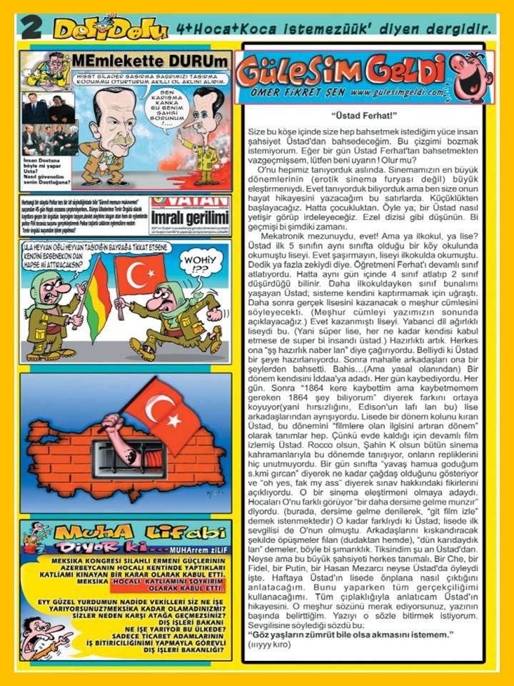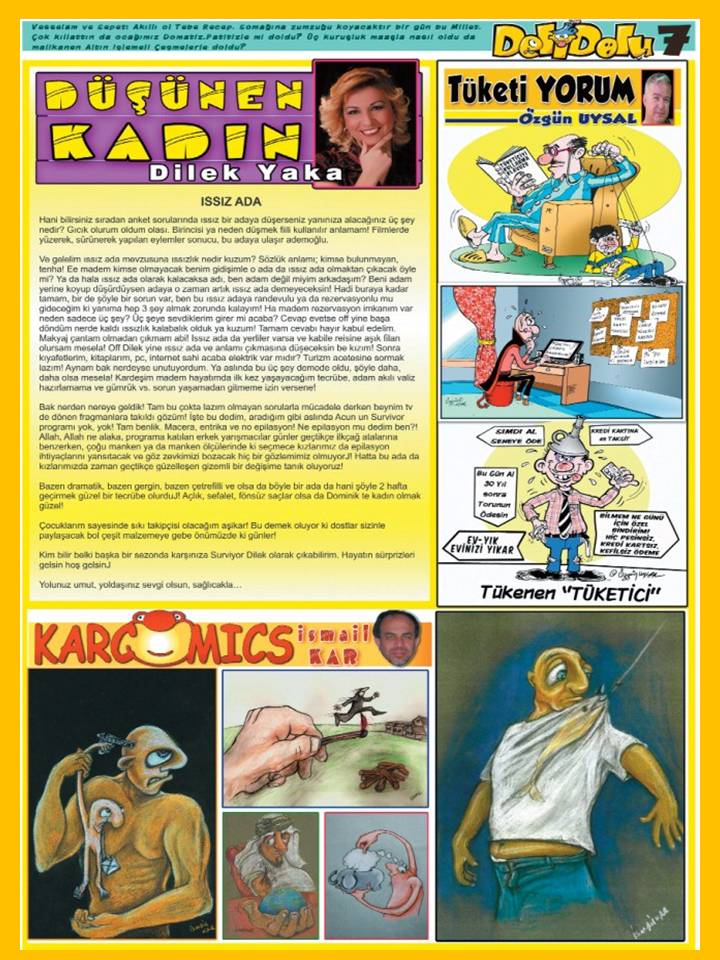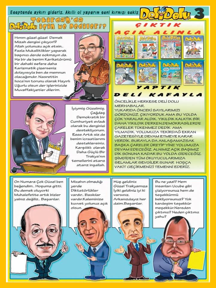 Tekirdağ "Ekran Gazetesi"nin ek ilavesi olarak tekrar yayınlanan Karikatürcü Mehmet Duru yönetimindeki Delidolu Mizah Dergisi çıktı ve abonelerine ücretsiz olarak gönderilmeye başladı...Halen ücretsiz olarak dağıtılan Delidolu Mizah Dergisine abonedelidolu@gmail.com adresinden üye olabilirsiniz... |