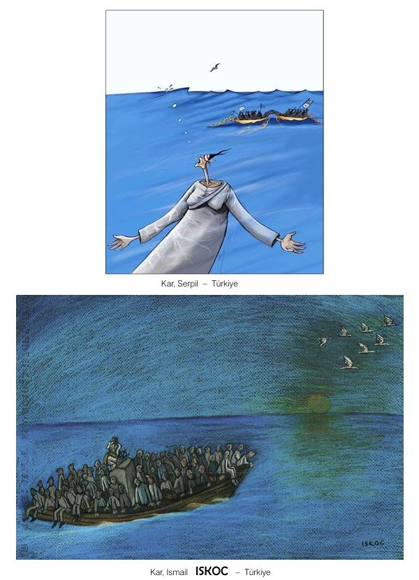 Dünyanın dört bir yanından sanatçıların 150'den fazla eseri, ironiyi ve çizgi romanı gerçeğin ve kınamanın araçlarına dönüştürüyor.