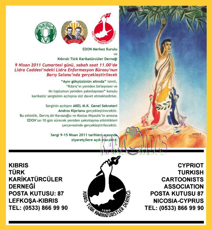(06 Nisan 2011 – Lefkoşa) EDON Gençlik Örgütü ile Kıbrıs Türk Karikatürcüler Derneği, 11 Nisan 1965 tarihinde, faili meçhul kişilerce öldürülen, PEO üyesi Derviş Ali Kavazoğlu ile Kostas Mişaulis anısına, Kıbrıslı Türk karikatürcülerin eserlerinden oluşacak “Aynı Gökyüzü Altında” isimli karma bir karikatür sergisi gerçekleştiriyorlar...9 Nisan 2011 Cumartesi günü, sabah saat 11.00’de, Rum Kesimi’ndeki Lidra Caddesi’nde (Lokmacı Barikatı Rum Kesimi), AKEL Genel Sekreteri Andros Kiprianu tarafından açılacak olan “Yeniden Yakınlaşma - Kıbrıs Türk Karikatürcüleri Sergisi”nde 9 Kıbrıslı Türk karikatürcünün 60 adet karikatürü yer alacaktır...M. Serhan Gazioğlu, Musa Kayra, Hüseyin Çakmak, Mustafa C. Azizoğlu, Mehmet Ulubatlı, Mustafa Tozakı, Cemal Tunceri, Arif A. Albayrak, Dolgun Dalgıçoğlu isimli çizerlerin eserlerinin yer alacağı karikatür sergisi, Lidra Caddesi’ndeki “Lidra Enformasyon Bürosu – Barış Salonu’nda yer alacaktır...“Yeniden Yakınlaşma - Kıbrıs Türk Karikatürcüleri Sergisi” 9 – 15 Nisan 2011 tarihleri arasında ziyarete açık olacaktır...Kıbrıs Türk Karikatürcüler Derneği Yönetim Kurulu |