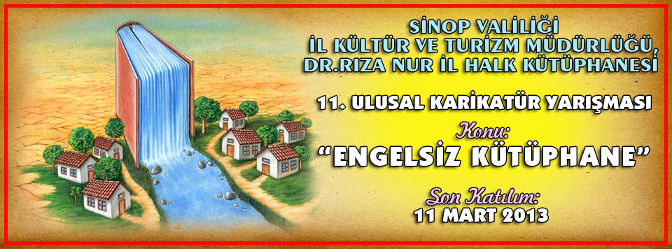 KONU : “ENGELSİZ KÜTÜPHANE” (49. Kütüphane Haftası Nedeniyle) 1- Yarışma “Karikatür” dalında yapılacaktır. Amatör ve profesyonel bütün karikatüristler katılabilir. 2- Yarışma 3 kategoride yapılacaktır. • Ortaokul 6. 7. 8. Sınıflar • Lise ve dengi okullar • 18 yaş ve üzeri yetişkinler 3- Karikatürler A4 (21x 29,7) ebadından küçük, A3 (29,7 x 42) ebadından büyük olmamalıdır. 4- Her katılımcı üç eserle yarışmaya katılabilir. (Üçten fazla gönderilen çalışmalar değerlendirmeye alınmayacaktır.) 5- Yarışmaya gönderilen karikatürler daha önce herhangi bir yarışmada ödül almamış olmalıdır. 6- Bilgisayarda üretilmiş çalışmalar kabul edilmeyecektir. 7- Karikatürler en geç 11 Mart 2013 Pazartesi - Süre Uzatıldı 15 mart 2013 Cuma - günü mesai bitimine kadar aşağıda belirtilen adrese ulaştırılmış olmalıdır.(Postadaki gecikmeler dikkate alınmayacaktır.) 8- Ödül töreni ve sergi açılışı Kütüphane Haftası kapsamında Sinop’ta yapılacaktır. 9- Yarışmaya katılacak karikatürler iade edilmeyecek ve çeşitli yayın ve etkinliklerde değerlendirilecektir. Katılımcı, herhangi bir telif hakkı veya ücret talep etmeyecektir. 10- Yarışmaya gönderilen karikatürlerin arkasına her katılımcı adını, soyadını, adres ve telefonunu yazmalıdır. Öğrenci katılımcılar ise ayrıca yaşlarını ve okullarını da belirteceklerdir. 11- Yarışmaya katılan karikatüristler tüm koşulları kabul etmiş sayılırlar.18 yaşından küçük katılımcıların kazandığı para ödülü veli/vasilerine verilir. 12- Yarışma Sinop Valiliği, bazı kurum ve meslekî kuruluşların maddî katkılarıyla gerçekleştirilecektir. ÖDÜLLER : YETİŞKİNLER : BÜYÜK ÖDÜL 1000 TL. , 5 KİŞİYE BAŞARI ÖDÜLÜ LİSE VE DENGİ OKULLAR : BÜYÜK ÖDÜL 500 TL., 5 KİŞİYE BAŞARI ÖDÜLÜ ORTAOKUL: BÜYÜK ÖDÜL 250 TL., 5 KİŞİYE BAŞARI ÖDÜLÜ SEÇİCİ KURUL : Hikmet TOSUN-İl Kültür ve Turizm Müdürü, Selçuk YÜKSEL-Kütüphane Müdürü, Altan ÖZESKİCİ-Karikatürist, Aşkın AYRANCIOĞLU-Karikatürist, E. Yaşar BABALIK-Karikatürist, Seyit SAATÇI-Karikatürist, Murat ÖZGEN-Sinop Bilim ve Sanat Merkezi Sanat E. Bölüm Bşk. YARIŞMA TAKVİMİ Son Katılım Tarih : 11 Mart 2013 Değerlendirme Tarihi : 13 Mart 2013 Sonuç Bildirimi : 15 Mart 2013 Sergi Açılışı ve Ödül Töreni : 26 Mart 2013 |
