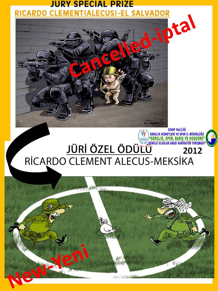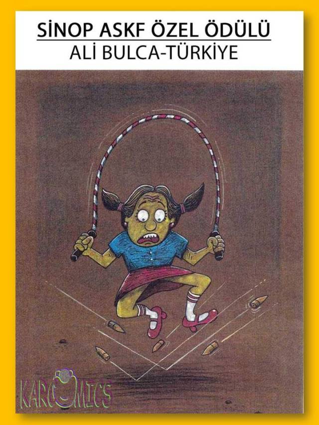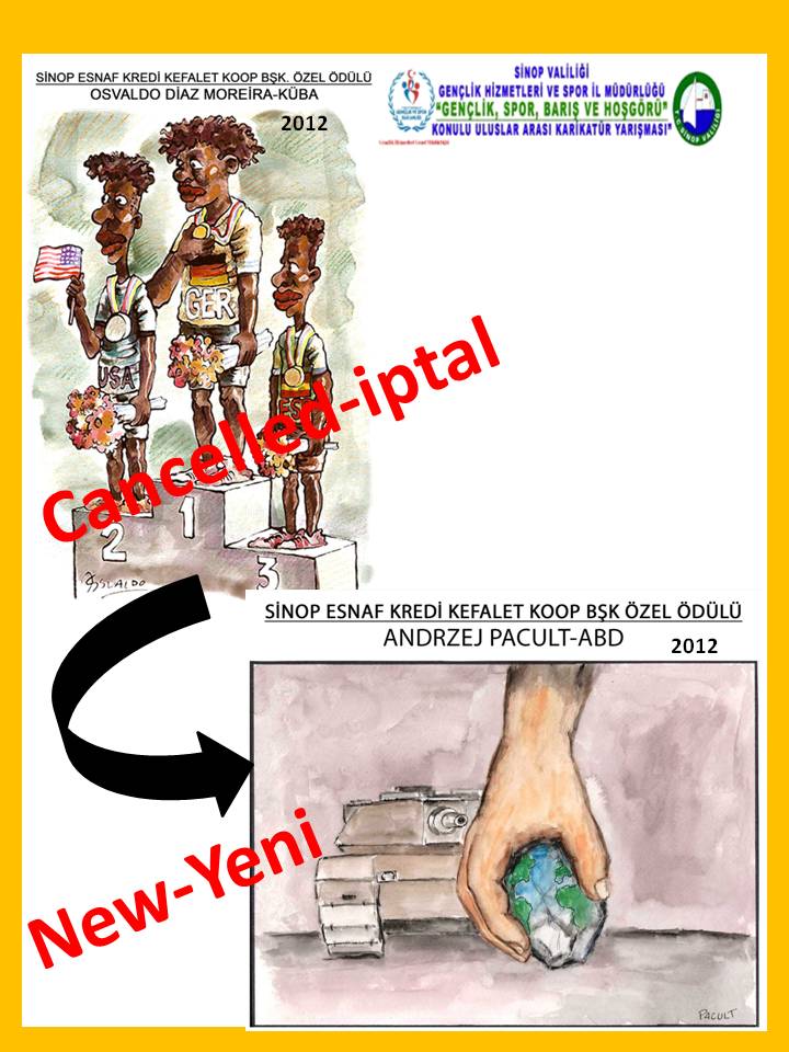 FİRST PRİZE: PAWEL KUCZYNSKİ-POLAND SECOND PRİZE: SUNNERBERG CONSTANTİN (COST)-BELGIUM THİRD PRİZE: ALTAN ÖZESKİCİ-TÜRKİYE -SPECİAL PRİZES JURY SPECIAL PRIZE:RİCARDO CLEMENT (ALECUS)-EL SALVADOR SİNOP 15 EYLÜL GAZETECİLER CEMİYETİ SPECIAL PRIZE:ALİREZA PAKDEL-İRAN SİNOP ASKF SPECIAL PRIZE:ALİ BULCA - TÜRKİYE AYANCIK BELEDİYESİ SPECIAL PRIZE:JITET KUSTANA-INDONESIA DURAĞAN GHS İLÇE MÜDÜRLÜĞÜ SPECIAL PRIZE:CHENGWEİ YİN-CHINA GERZE BELEDİYESİ SPECIAL PRIZE:OĞUZ GÜREL-TURKEY ERFELEK GHS İLÇE MÜDÜRLÜĞÜ SPECIAL PRIZE:CEMALETTİN GÜZELOĞLU-TURKEY BOYABAT GHS İLÇE MÜDÜRLÜĞÜ SPECIAL PRIZE:MEHDİ AZİZİ-İRAN AYANCIK GHS İLÇE MÜDÜRLÜĞÜ SPECIAL PRIZE:YURİY KOSOBUKİN-UKRAINE ERFELEK GENÇLİK MERKEZİ SPECIAL PRIZE:DARİUSH RAMEZANİ-İRAN boyabatgazetesi.com SPECIAL PRIZE:İLYA KATZ-İSRAEL SİNOP GENÇLİK MERKEZİ SPECIAL PRIZE:TAWAN CHUNTRASKAWVONG (TAYLAND) SİNOP İL GENEL MECLİSİ SPECIAL PRIZE:ŞEVKET YALAZ-TURKEY BOYABAT Y. TOPÇU YBO SPOR KULÜBÜ SPECIAL PRIZE:BURHANETTİN YILDIZ-TURKEY SİNOP ESNAF KREDİ KEFALET KOOP. BAŞKL. SPECIAL PRIZE:OSVALDO DİAZ MOREİRA-CUBA TÜRKELİ GHS İLÇE MÜDÜRLÜĞÜ SPECIAL PRIZE:ANDRZEJ PACULT (ABD) -RESULTS OF UNDER THE AGE OF 18 YOUTH PRİZE:ÇEVİK BASMACI-TURKEY, BERKİN KURTULMUŞ- TURKEY, GÜLÇİN ÇALIŞKAN- TURKEY -SPECIAL PRİZE JURY SPECIAL PRIZE:ÖZGÜR CEM TAŞ- TURKEY SİNOP İFA ALIŞVERİŞ MERKEZİ SPECIAL PRIZE:SONER KOTBAŞ- TURKEY BOYABAT Y. TOPÇU YBO KARİKATÜR ATÖLYESİ SPECIAL PRIZE:DOĞA ZEREN SİPAHİ- TURKEY BOYABAT SESİ GAZETESİ SPECIAL PRIZE:OĞUZ TUNA ORAK- TURKEY SİNOP GENÇLİK MERKEZİ KARİKATÜR GRUBU SPECIAL PRIZE:HAKAN ULUCAN- TURKEY SİNOP GENÇLİK SPOR KULÜBÜ SPECIAL PRIZE:EKİN ÖZESKİCİ- TURKEY GERZE GHS İLÇE MÜDÜRLÜĞÜ SPECIAL PRIZE:VICTOR JENHEİ NAKAMOTOME-BRASIL SİNOP KÖKDEMİR İÇECEK-GIDA LTD. ŞTİ. SPECIAL PRIZE:BAHA ÖNCEL- TURKEY 1000 USD and a plaquette are going to be given as the first prize, 750 USD and a plaquette are going to be given as the second prize and 500 USD and a plaquette are going to be given as the third prize. 100 USD and a plaquette are going to be given to the cartoonists under the age of 18 as the youth prize. The rest of the special prizes are going to be given as plaquettes. A catalogue is going to be prepared with the cartoons winning a prize and the ones regarded to be exhibited and this catalogue is going to be sent to the cartoonists, the cartoons of whom are published in the cataloque. The Prize Ceremony and the opening of the exhibition are going to be announced after the catalogue is published. The catalogue and the prizes of the cartoonists who cannot join the prize ceremony are going to be sent to their addresses. We would like to thank all the cartoonists attending to our competition for their contribution and for paying attention to international themes such as “sports, peace and tolerance”. GOVERNORSHIP OF SİNOP AND SİNOP DİRECTORATE OF YOUTH AND SPORTS |