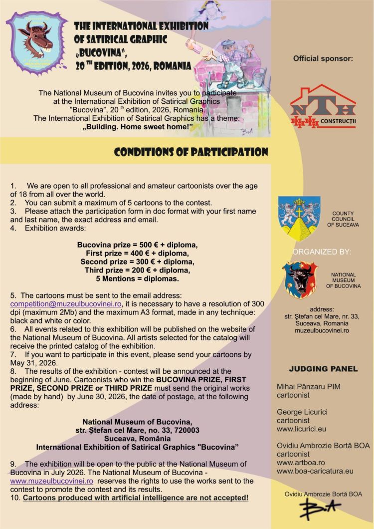 | The National Museum of Bucovina invites you to participate at the International Exhibition of Satirical Graphics "Bucovina", 20 th edition, 2026, Romania. The International Exhibition of Satirical Graphics has\a theme: ,,Building. Home sweet home!" "' Conditions of or participation 1. We are open to all professional and amateur cartoonists over the age of 18 from all over the world. 2. You can submit a maximum of 5 cartoons to the contest. 3. Please attach the participation form in doc format with your first name and last name, the exact address and email. 4. Exhibition awards: Bucovina prize = 500 € + diploma, First prize = 400 € + diploma, Second prize = 300 € + diploma, Third prize = 200 € + diploma, 5 Mentions = diplomas. 5. The cartoons must be sent to the email address: competition@muzeulbucovinei.ro, it is necessary to have a resolution of 300 dpi (maximum 2Mb) and the maximum A3 format, made in any technique: black and white or color. 6. All events related to this exhibition will be published on the website of the National Museum of Bucovina. All artists selected for the catalog will receive the printed catalog of the exhibition. 7. If you want to participate in this event, please send your cartoons by May 31, 2026. 8. The results of the exhibition - contest will be announced at the beginning of June. Cartoonists who win the BUCOVINA PRIZE, FIRST PRIZE, SECOND PRIZE or THIRD PRIZE must send the original works (made by hand) by June 30, 2026, the date of postage, at the following address: National Museum of Bucovina, str. tefan eel Mare, no. 33, 720003 Suceava, Romania International Exhibition of Satirical Graphics "Bucovina" 9. The exhibition will be open to the public at the National Museum of Bucovina in July 2026. The National Museum of Bucovina - www.muzeulbucovinei.ro reserves the rights to use the works sent to the contest to promote the contest and its results. 10. Cartoons produced with artificial intelligence are not accepted! |