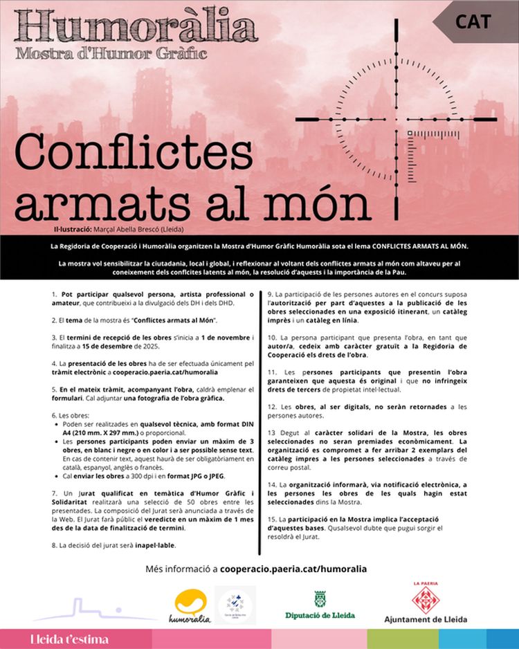 Through this theme, Humoràlia seeks to promote the values of a culture of peace and to deepen understanding of today’s world, with particular emphasis on the conflicts that, regrettably, still persist internationally. The aim is to encourage reflection on ongoing conflicts and the need for peaceful resolution.