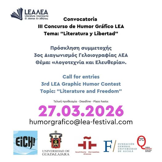 | Call for entries – Competition III International Exhibition of Graphic Humor LEA The competition is open to all cartoonists worldwide, over 18 years of age, regardless of nationality, religion, gender and education. Graphic Humor Theme: “Literature and Freedom” Send your entry by email to the following address: humorgrafico@lea-festival.com. The deadline for submissions is March 27th, 2026. Check the rules of the contest in our website: www.lea-festival.com The LEA Graphic Humor Exhibition is organized by the non-profit company LEA Festival Desarrollo Intercultural, in collaboration with the International Cartoon and Comic Strip Encounter (EICH), the University Center for Art, Architecture and Design (CUAAD) of the University of Guadalajara, Jalisco, Mexico, and the Quevedo Institute of Humor Arts (IQH) of the General Foundation of the University of Alcalá, Spain (UAH). The exhibition will initially be held at the Cervantes Institute of Athens, and is curated by the Colombian-Spanish cartoonist Adriana Mosquera (nani). @institutocervantesatenas @naniopina @institutoquevedohumor @enccaricatura |