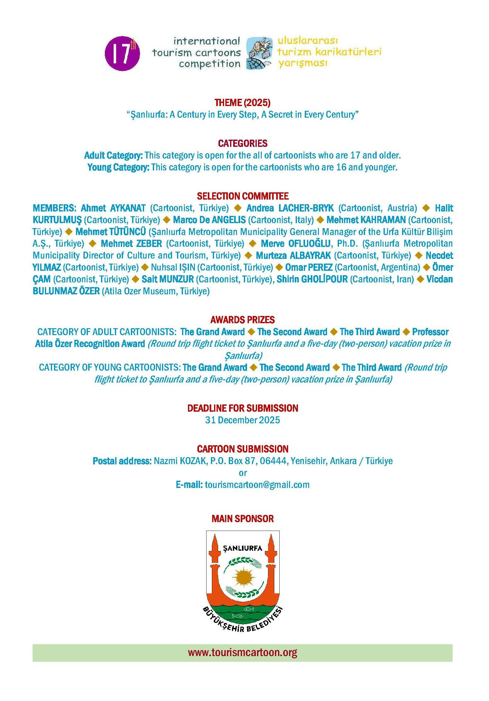 Cartoons submitted for selection may be printed in the publication of the Anatolian Tourism Academy and in other printed materials of this organization, such as books, catalogs, brochures, postcards, websites and posters. All rights of other publications other than these belong to the owner of the drawing.Cartoons submitted for selection may be printed in the publication of the Anatolian Tourism Academy and in other printed materials of this organization, such as books, catalogs, brochures, postcards, websites and posters. All rartoons submitted for selection may be printed in the publication of the Anatolian Tourism Academy and in other printed materials of this organization, such as books, catalogs, brochures, postcards, websites and posters. All rights of other publications other than these belong to the owner of the drawing.